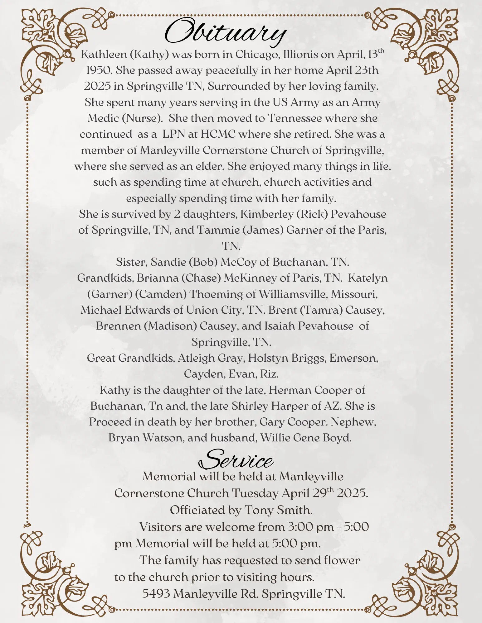 Kathleen Jean Boyd – Age 75 – Springville, TN